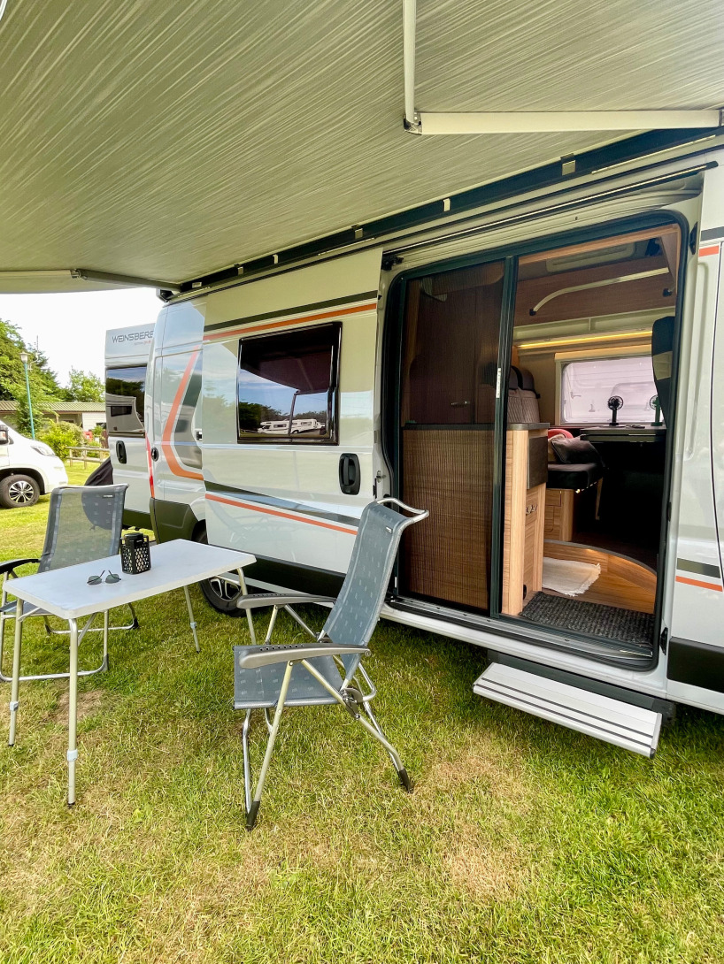 Nachdem wir relativ kurzfristig, nach telefonischer Reservierung, hier einen der letzten Plätze bekommen haben, ist 20 Minuten nach Ankunft, alles fix und fertig hergerichet. Stromanschluss, Campingsessel und Tisch plus Markise.